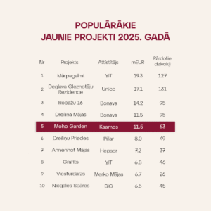 Kaamos projekti pērn saglabājuši augstu pircēju interesi – Moho Garden Mežaparkā iekļauts 2025. gada populārāko jauno projektu TOP 10, ieņemot 5. vietu pēc darījumu apjoma. Projektā pārdoti 63 dzīvokļi par kopējo summu 11,5 miljoni eiro, apliecinot noturīgu pieprasījumu pēc kvalitatīviem un ilgtspējīgiem mājokļiem labās lokācijās.